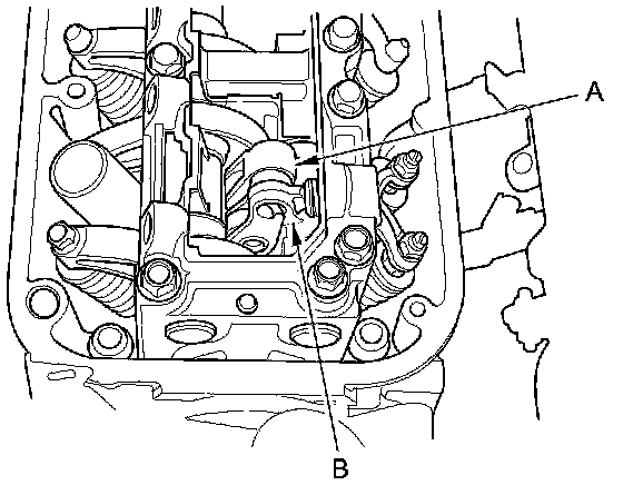 3. Rotate the crankshaft pulley clockwise. Make sure that the intake primary rocker arm (A) and the intake secondary rocker arm (B) are separated and that the intake primary rocker arm should move independently: