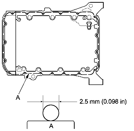 - Apply a 2.5 mm (0.098 in) diameter bead of liquid gasket along the broken line (A).