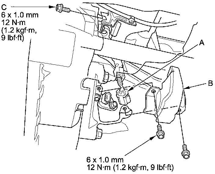 7. Connect the CKP sensor connector (A), then install the CKP sensor cover (B) and the bolt (C).