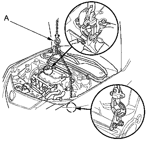 2. Position the engine/transmission under the vehicle. Be sure that they are properly aligned. Carefully lower the vehicle until the engine/transmission are properly positioned in the engine compartment. Make sure the vehicle is not resting on any part of the engine/transmission. Support the engine/transmission with a chain hoist (A) and carefully raise the engine/transmission into place.