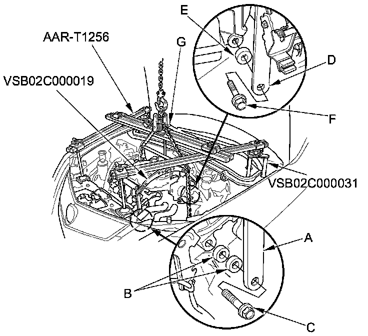 5. Install the engine support hanger (AAR-T1256) onto the vehicle as shown, and attach the hook to the slotted hole in the engine hanger balance bar. Tighten the wing nut (G) by hand, and lift and support the engine/transmission.
