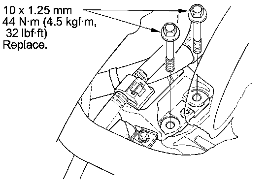 6. Install the new mounting bolts into the upper half of the side engine mount bracket. Tighten the bolts to the specified torque.