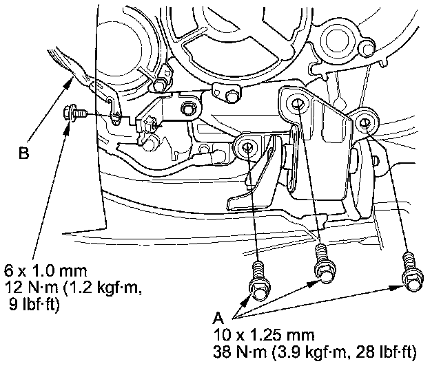12. Tighten the lower transmission mount mounting bolts (A) and the ground cable (B).