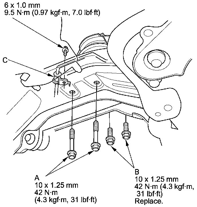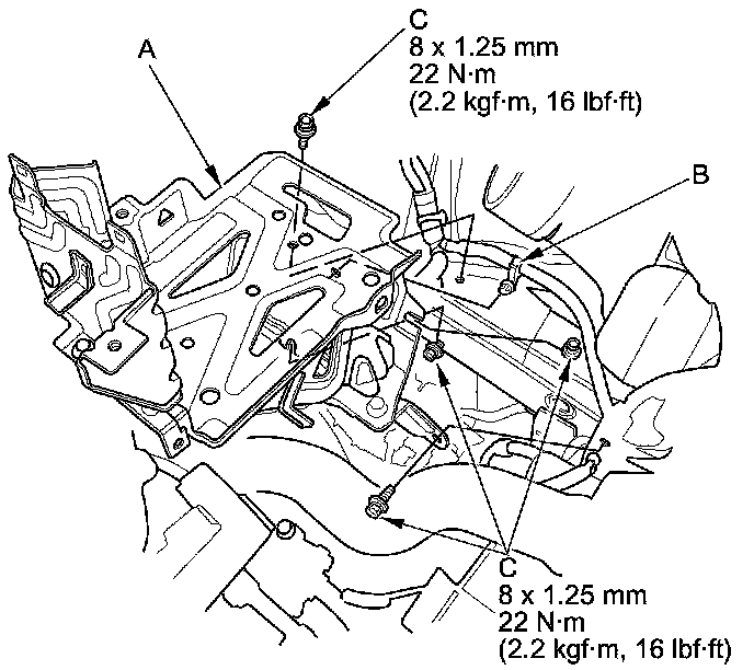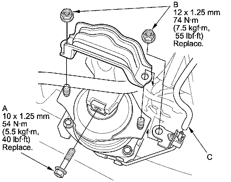 13. Tighten the rear engine mount base mounting bolts (A) and new mounting bolts (B), then install the power steering line bracket (C).