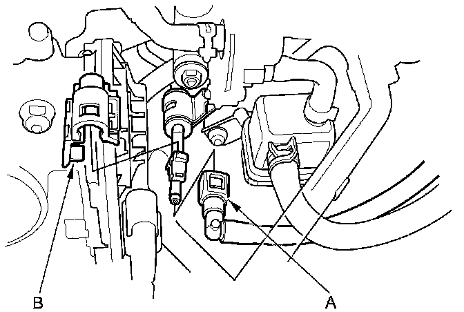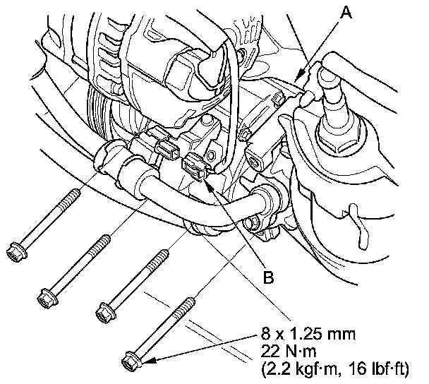 18. Install the A/C compressor (A), then connect the A/C compressor clutch connector (B).