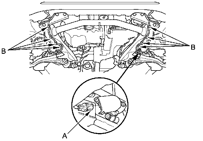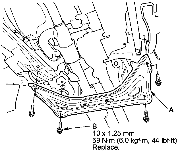 32. Install the front subframe stiffener (A) using new bolts (B).