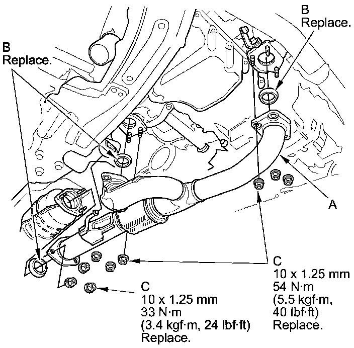 31. Install exhaust pipe A using new gaskets (B) and new self-locking nuts (C).