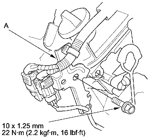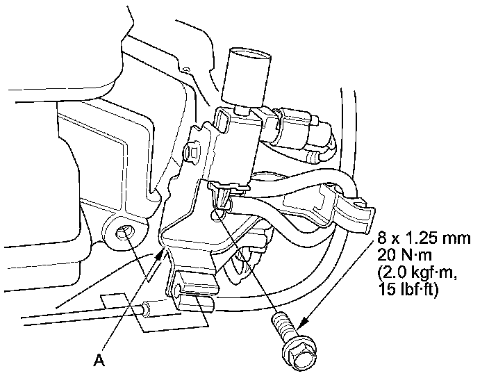 38. Install the engine mount control solenoid valve bracket (A) to the rear cylinder head.