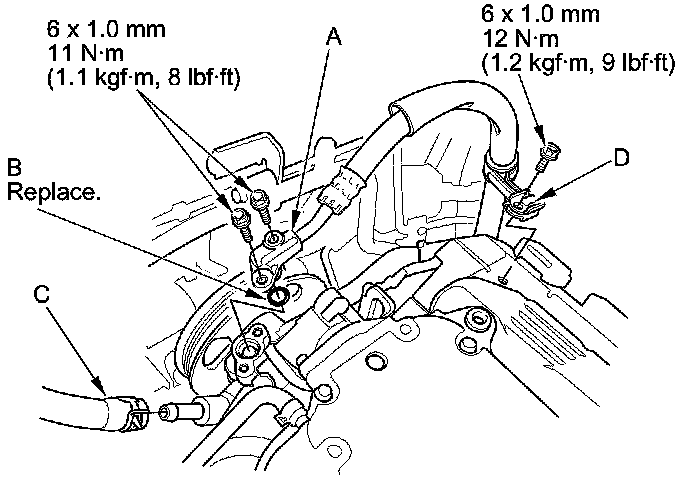 40. Install the power steering hose bracket (D) to the rear cylinder head cover.