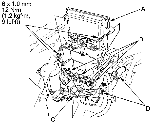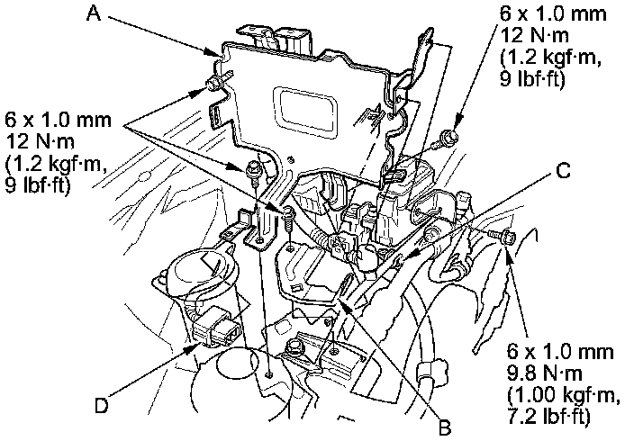 42. Install the PCM bracket (A) and the harness bracket (B), then install the A/C receiver line clamp (C) and the connector (D) to the PCM bracket.