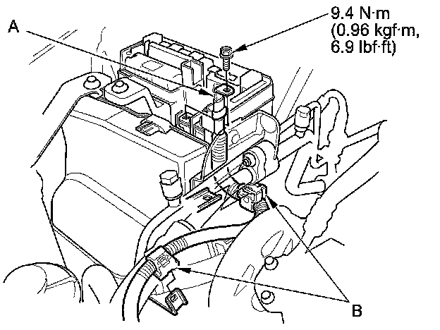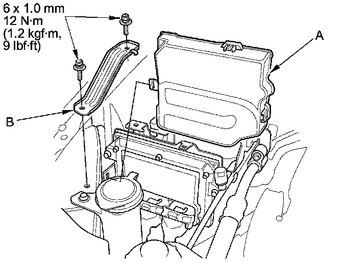 44. Install the PCM cover (A), then install the bracket (B).