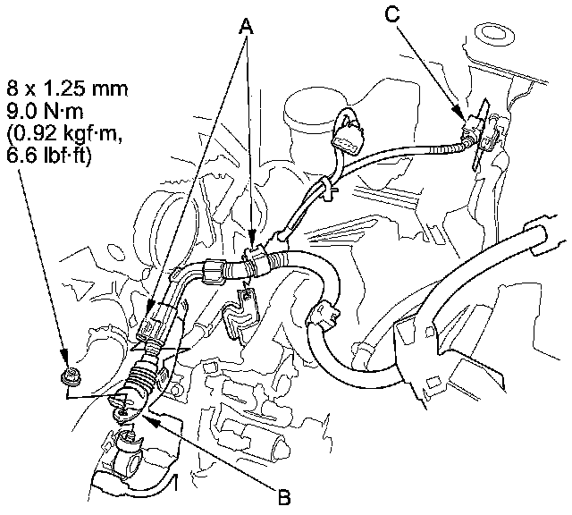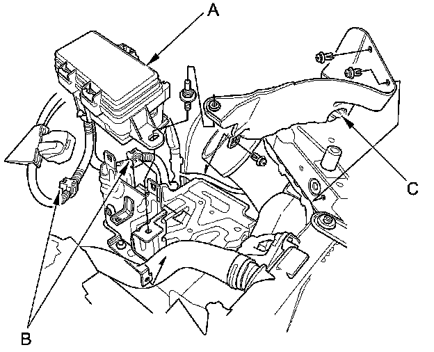 16. Tighten the new front engine mount bolt (A), then install the new front engine mount stop mounting nuts (B) and connect the front engine mount control solenoid valve hose (C).