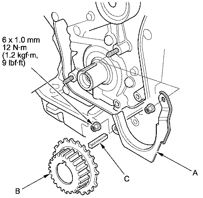 2. Remove the timing belt stopper (A), then remove the timing belt drive pulley (B) and the key (C).