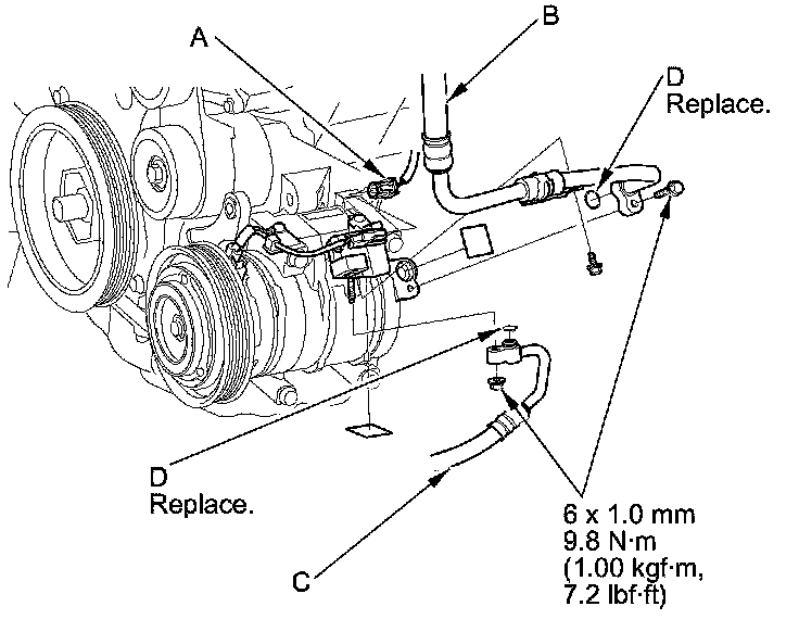 6. Disconnect the A/C compressor clutch connector (A). Remove the bolts and the nut, then disconnect the suction hose (B) and the discharge hose (C) from the A/C compressor. Remove the O-rings (D). Plug or cap the lines immediately after disconnecting them to avoid moisture and dust contamination.