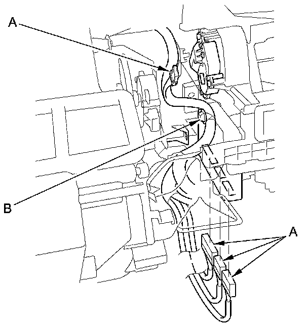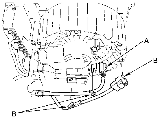 9. Disconnect the connector (A) from the blower motor. Detach the wire harness clips (B).
