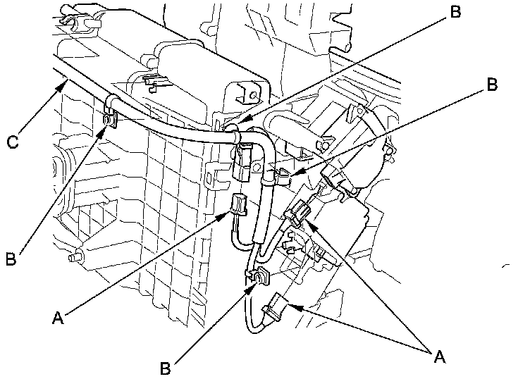 5. From under the hood, slide the hose clamps (A) back. Disconnect the inlet heater hose (B) and the outlet heater hose (C) from the heater unit. Note the layout of the hoses.