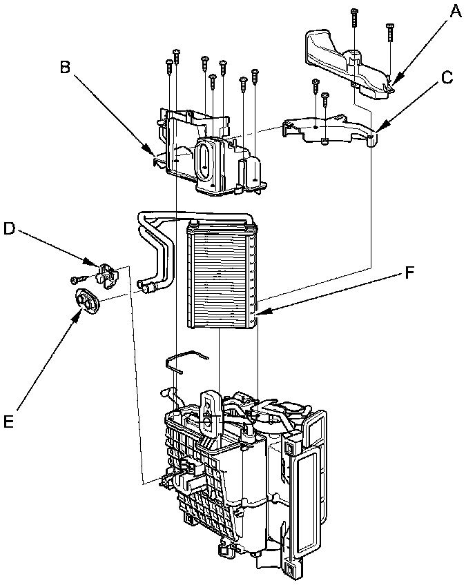14. Remove the self-tapping screw, the heater pipe bracket (D), and the grommet (E), and carefully pull out the heater core (F).