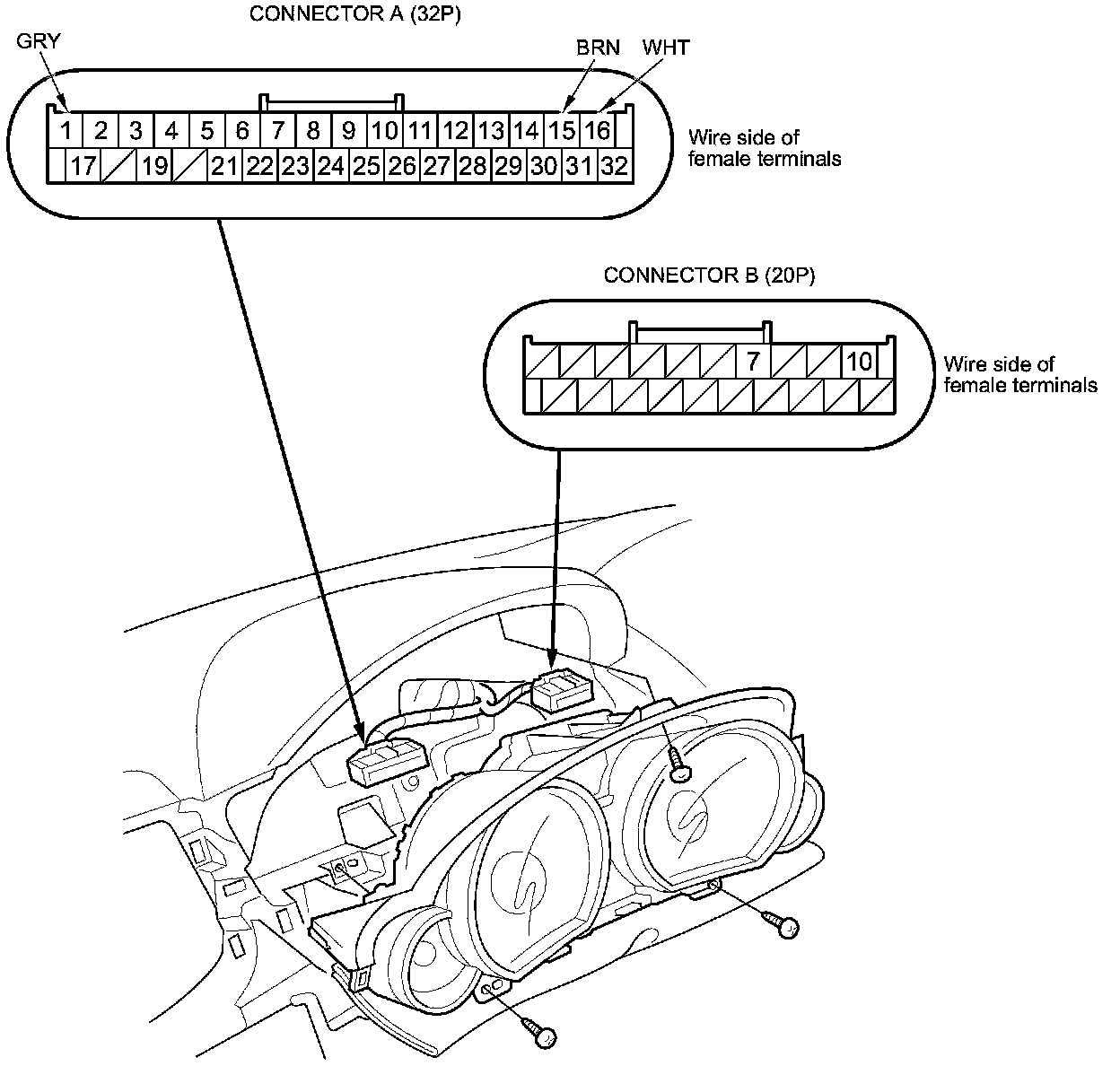 12. Remove the gauge control module, and disconnect connector A (32P) and B (20P) from it.