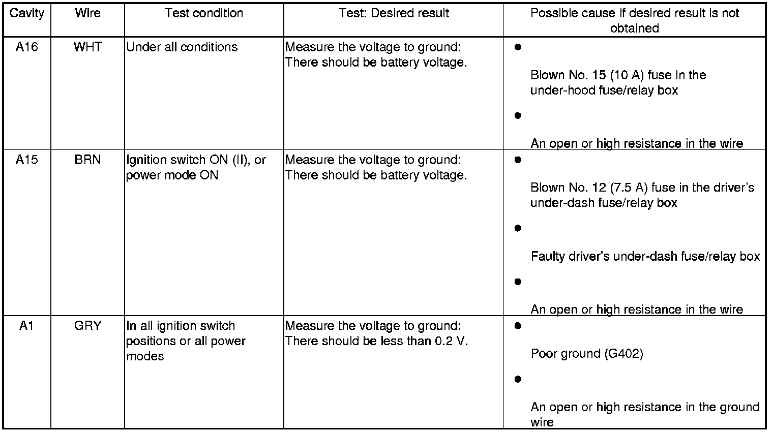 6. Reconnect the connectors to the driver's under-dash fuse/relay box, and do the following input tests.