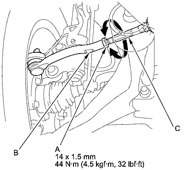 3. Loosen the tie-rod end locknuts (A) while holding the flat surface sections (B) of the tie-rod end with a wrench, and turn both tie-rods (C) until the front toe is within specifications.