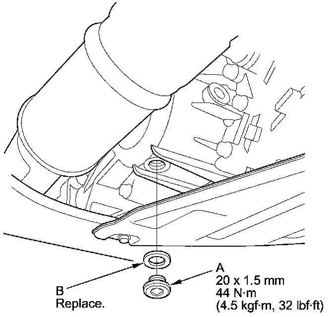 5. Reinstall the drain plug with a new sealing washer (B).
