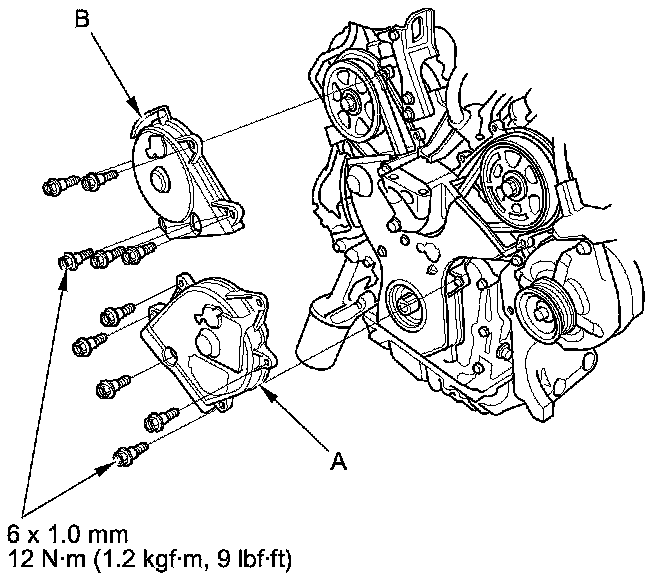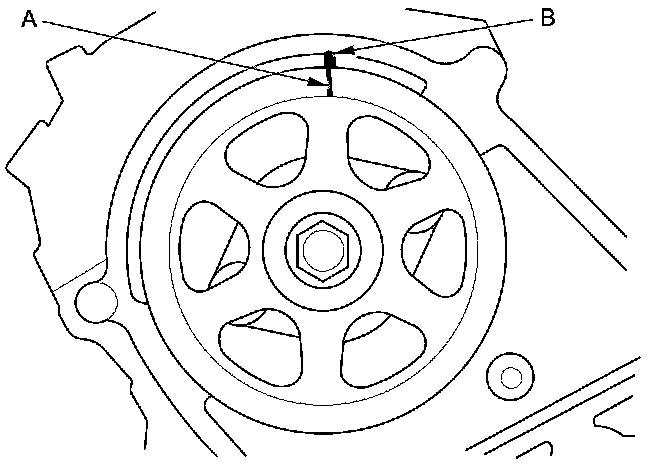 3. Set the timing belt drive pulley to top dead center (TDC) by aligning the TDC mark (A) on the tooth of the timing belt drive pulley with the pointer (B) on the oil pump.