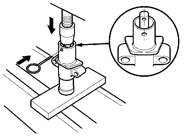 8. Use a hydraulic press to slowly compress the auto-tensioner. Insert a 2.0 mm (5/64 in) pin through the housing and the rod.