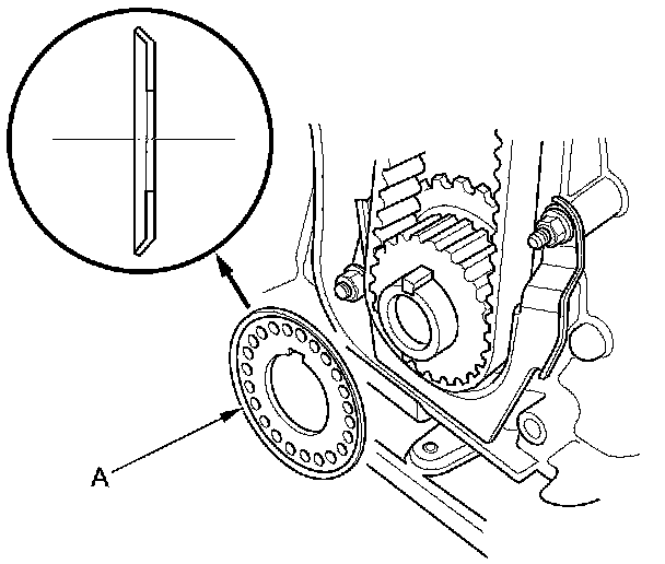 22. Turn the crankshaft pulley so its white mark (A) lines up with the pointer (B).