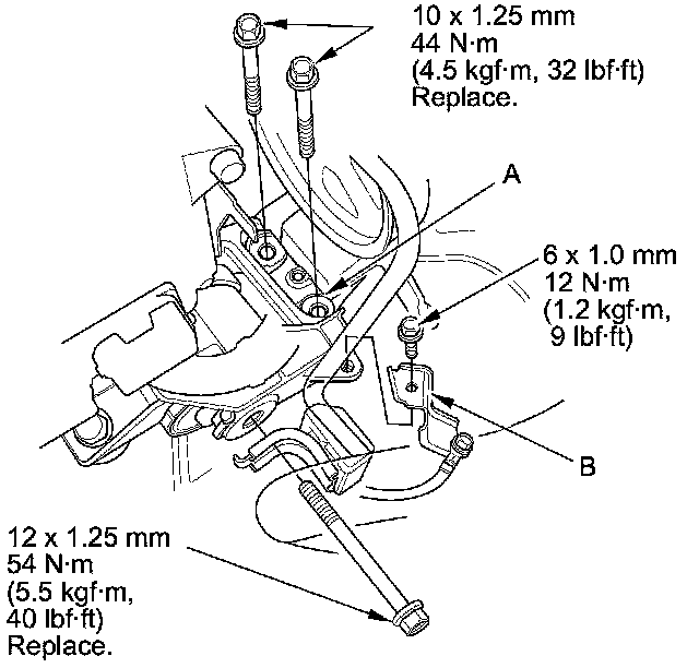 24. Loosely install the upper half of the side engine mount bracket (A), then install the ground cable bracket (B).