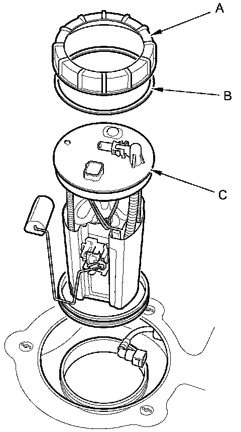 7. Remove the locknut (A), the locknut plate (B), and the fuel tank unit (C).