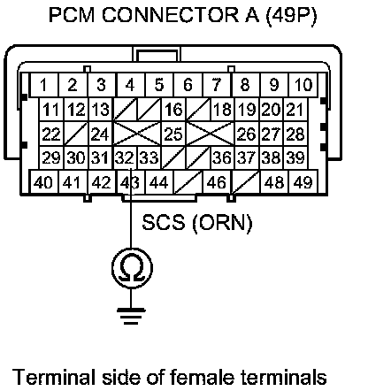 7. Check for continuity between PCM connector terminal A32 and body ground.