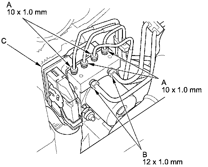 3. Disconnect the 10 mm brake lines (A) and the 12 mm brake lines (B) from the VSA modulator-control unit (C).