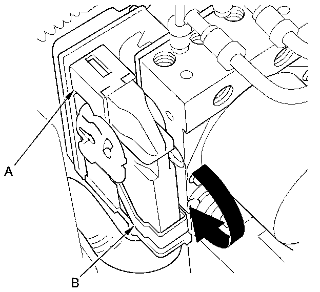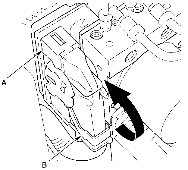 4. Disconnect the VSA modulator-control unit 46P connector (A) by pulling up the lever (B); the connector disconnects itself.
