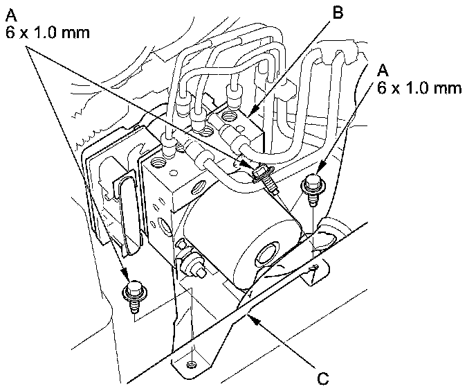 5. Remove the VSA modulator-control unit bracket mounting bolts (A), then remove the VSA modulator-control unit (B) with the bracket (C) from the body.