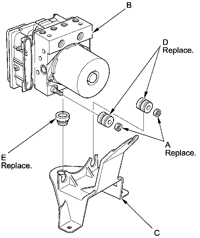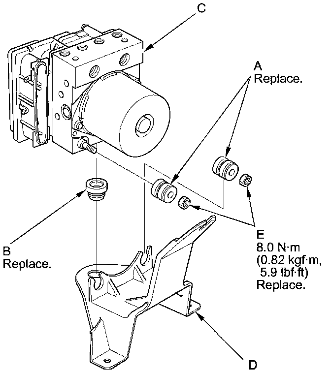 2. Install the VSA modulator-control unit on the bracket (D), then install the new locknuts (E).