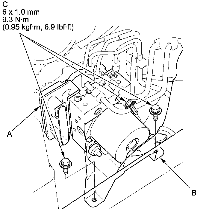 3. Install the VSA modulator-control unit (A) with the bracket (B) to the body, then install the VSA modulator-control unit bracket mounting bolts (C).