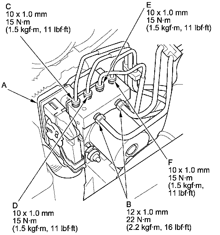 6. Connect the 10 mm brake lines and the 12 mm brake lines to the VSA modulator-control unit (A).