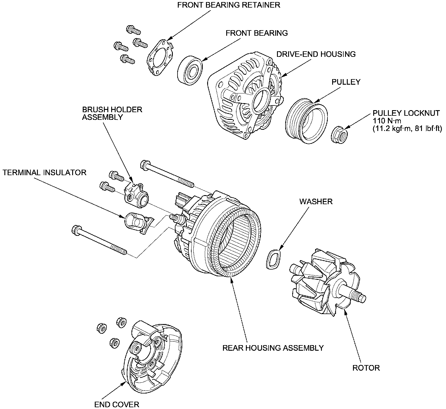 16. If you removed the pulley, put the rotor in the drive-end housing, then torque its locknut to 110 Nm (11.2 kg-m, 81 lb-ft).