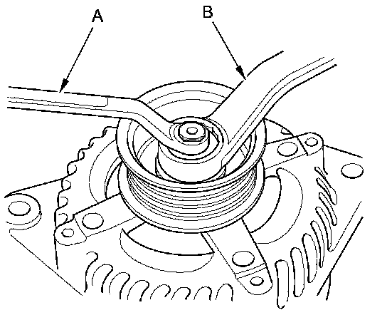 3. If the front bearing needs replacing, remove the pulley locknut with a 10 mm wrench (A) and a 22 mm wrench (B). If necessary, use an impact wrench.