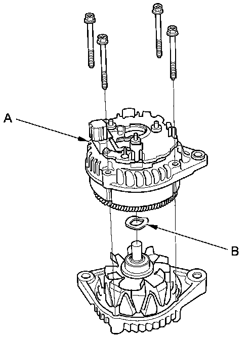 7. Remove the four through bolts, then remove the rear housing assembly (A) and the washer (B).