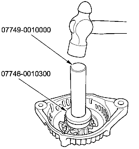 12. Install a new front bearing in the drive-end housing with a hammer, the driver handle, 15 x 135L, and the bearing driver attachment, 42 x 47 mm.