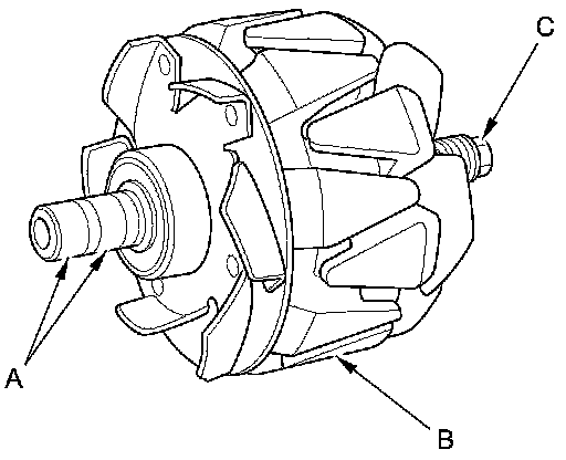 15. Check for continuity between each slip ring and the rotor (B) and the rotor shaft (C).