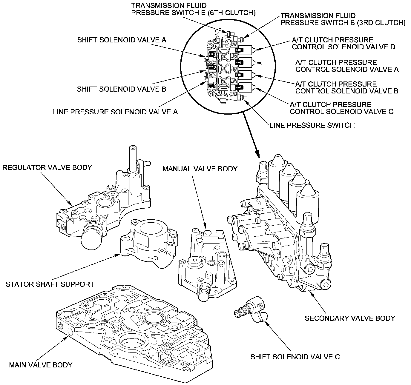 The valve bodies include the main valve body, the regulator valve body, the secondary valve body, the stator shaft support, and the manual valve body. The ATF pump is driven by splines on the end of the torque converter which is attached to the engine. Fluid flows through the main regulator valve to maintain specified pressure through the manual valve body, directing pressure to each of the clutches. The hydraulic control body is attached to the secondary valve body, which includes the main shift hydraulic circuit, the solenoid valves, the hydraulic pressure switches, etc. to shorten the fluid passage and optimize the hydraulic pressure. The secondary valve body has shift solenoid valves A and B, line pressure solenoid valve A, the line pressure switch, transmission fluid pressure switch B (3rd clutch), transmission fluid pressure switch E (6th clutch), and automatic transmission (A/T) clutch pressure control solenoid valves A, B, C, and D, and is mounted to the transmission housing. Shift solenoid valve C is mounted to the torque converter housing.