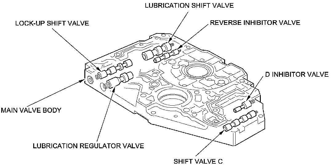 The main valve body contains shift valve C, the D inhibitor valve, the reverse inhibitor valve, the lock-up shift valve, the lubrication regulator valve, the lubrication shift valve, the ATF pump drive gear, and the ATF pump driven gear. The primary function of the main valve body is to switch hydraulic pressure on and off to control the hydraulic control system.