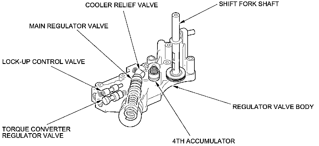 The regulator valve body is located on the main valve body. The regulator valve body contains the main regulator valve, the cooler relief valve, the torque converter regulator valve, the lock-up control valve, the shift fork shaft, and the 4th accumulator.