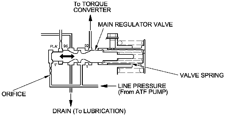 The main regulator valve maintains constant hydraulic pressure from the ATF pump to the hydraulic control system, while also providing fluid to the torque converter and the lubrication system. Fluid from ATF pump flows through the 1 cavity and the 1' cavity of the main regulator valve. Then the fluid entered in the 1' cavity pushes the main regulator valve to the spring side, this movement uncovers the fluid ports to the torque converter and the lubrication system on the main regulator valve. The fluid flows out to the torque converter and the lubrication system, then the main regulator valve returns under spring force when the pressure in the 1' cavity of the main regulator valve is lowered below that in the 1 cavity, which covers the fluid ports to the torque converter and the lubrication system. According to the level of the hydraulic pressure through the 1' cavity, the position of the main regulator valve changes, and the amount of fluid from the 1 cavity through the torque converter changes. This operation is continued maintaining the line pressure.