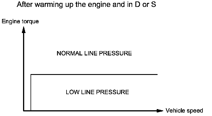 Both in D or S under low engine load condition after warming up the engine and in all ranges (P, R, N, D, or S) under the low ATF temperature condition, the PCM operates line pressure solenoid valve A, and switches the line pressure to a pressure that is lower than normal. This operation can reduce the friction in the transmission.