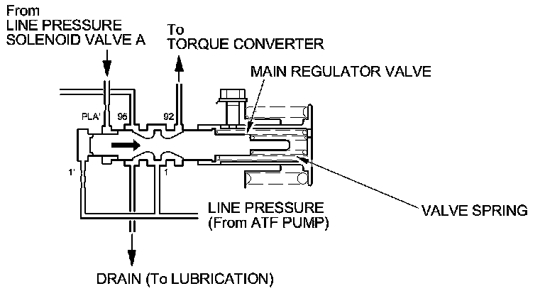 The PCM turns line pressure solenoid valve A on, and applies the hydraulic pressure to the PLA' cavity on the main regulator valve. When hydraulic pressure is applied to the PLA' cavity, the main regulator valve is pushed to the spring side. This operation reduces the drain port of the main regulator valve, and causes the line pressure to be lower than normal.