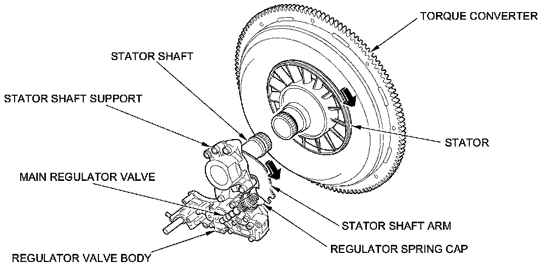 Increases in hydraulic pressure according to torque are regulated by the main regulator valve using stator torque reaction. The stator shaft is splined to the stator in the torque converter, and the stator shaft arm end contacts the regulator spring cap. When the vehicle is accelerating or climbing (torque converter range), stator torque reaction occurs on the stator shaft, and the stator shaft arm pushes the regulator spring cap in the direction of the arrow in proportion to the reaction. The stator reaction spring compresses, and the main regulator valve moves to increase the line pressure which is regulated by the main regulator valve. The line pressure reaches its maximum pressure when the stator torque reaction reaches its maximum position.