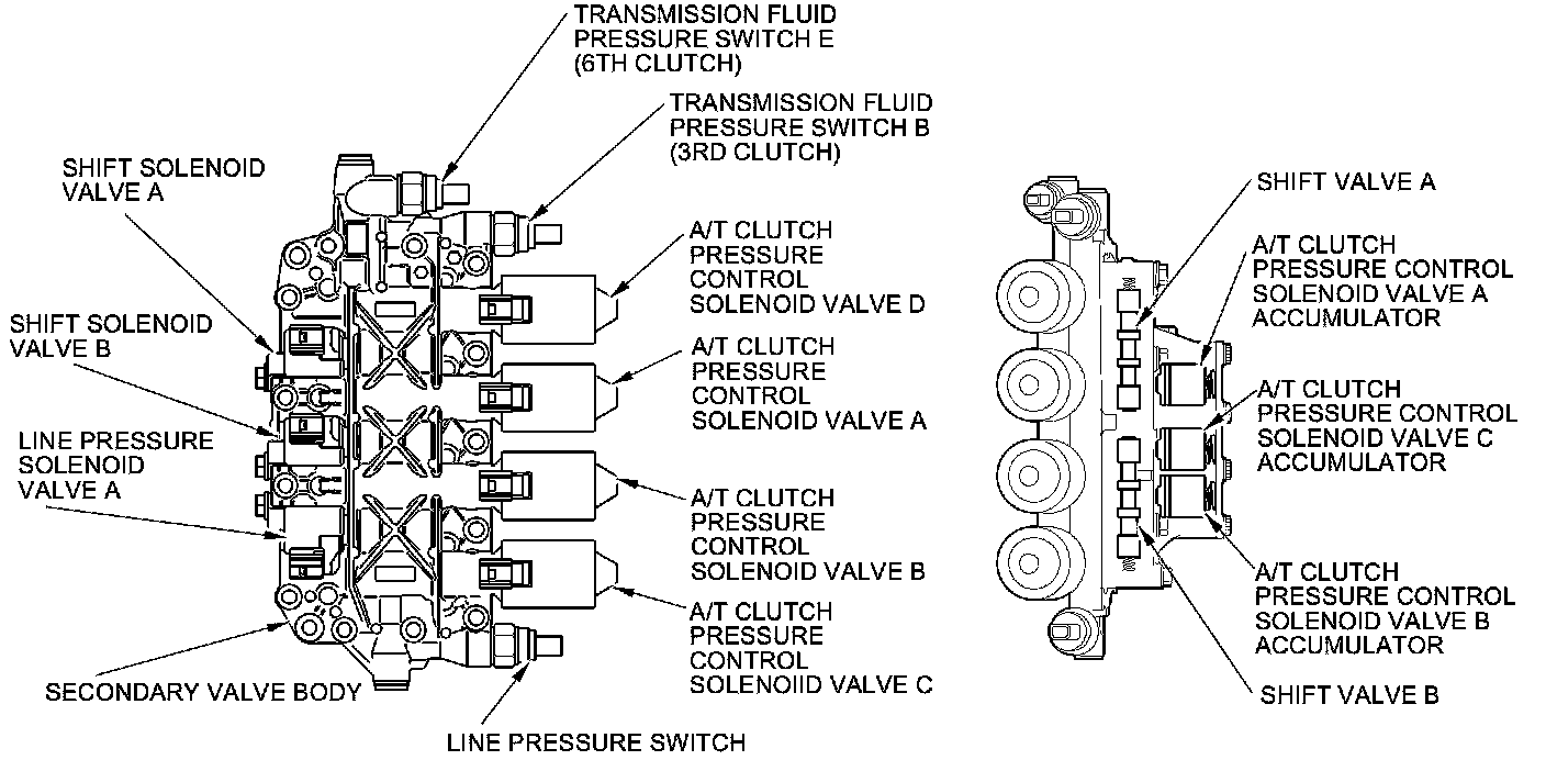 The secondary valve body contains the main shift hydraulic circuit, the solenoid valves, the hydraulic pressure switches, etc. The secondary valve body consists of shift solenoid valves A and B, line pressure solenoid valve A, A/T clutch pressure control solenoid valves A, B, C, and D, shift valves A and B, the A/T clutch pressure control solenoid valve A accumulator, the A/T clutch pressure control solenoid valve B accumulator, the A/T clutch pressure control solenoid valve C accumulator, the line pressure switch, transmission fluid pressure switch B (3rd clutch), and transmission fluid pressure switch E (6th clutch). The secondary valve body is mounted on the transmission housing.